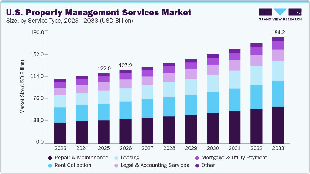 The U.S. property management services market is projected to grow from 122.02 billion dollars in 2025 to 184.25 billion dollars by 2033, driven by new construction, investor demand, and tech-enabled management that automates more day-to-day operations.